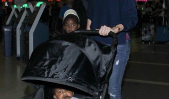 Charlize Theron was photographed departing on a flight at LAX airport with her kids Jackson and August in Los Angeles, CA on Friday (Feb. 10).