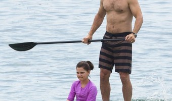 A shirtless and buff Eric, 45, was spotted teaching his children his paddle boarding moves! Eric…