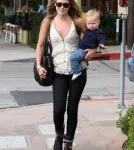 Larter was seen taking her 9-month-old son Theodore to a doctor’s appointment in Brentwood, California on Monday. The proud mom smiled as she carried her son around on her hip to and from the clinic. Larter wore black skinny jeans with a vintage frilly top while Theodore wore a blue Polo sweater with jeans.