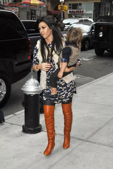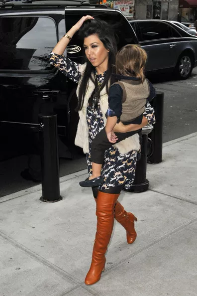 Kourntey and little Mason looked stylish as they entered their NYC hotel. Kardashian wore a long dress and fur vest paired with long boots. Mason wore black jeans, a navy top with a vest.
