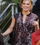 Hilary Duff stopped by the ‘Chelsea Lately Show’ studios to promote her new book Devoted, in Los Angeles on Monday. Duff glowed while wearing a leopard print blouse and black skinny trousers. She was joined by husband Mike Comrie.