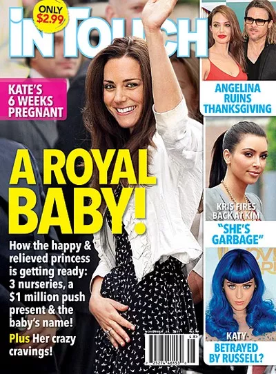 In Touch magazine claims the Duchess of Cambridge Kate Middleton is expecting her first child with her husband Prince William. Furthermore, they claims she is six weeks pregnant. They have the story on how happy Kate is and her preparations to get the three nurseries ready. They also claims she has a $1 million push toy for the baby and they know the details of the baby’s name. My In Touch has been busy this week. Not to leave out anything they also have the 911 on what cravings Kate has.