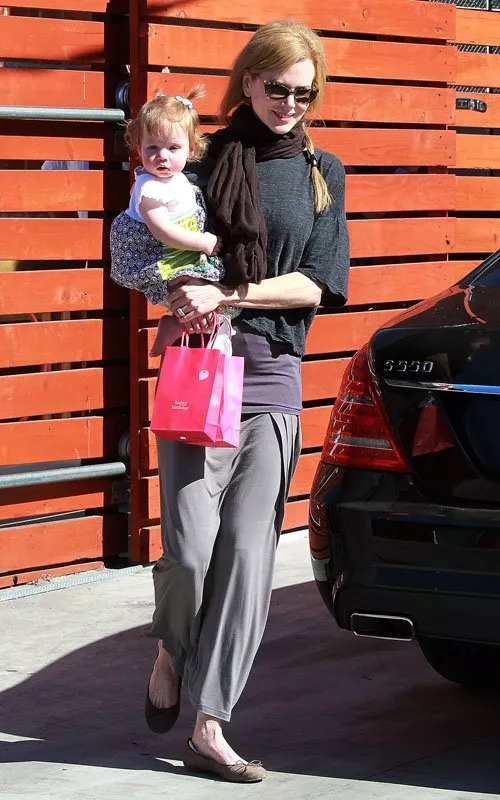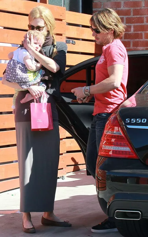 Nicole Kidman, her husband Keith Urban and their adorable daughters Sunday Rose and Faith Margaret were spotted leaving a birthday party at ROMP in Hollywood, CA on Sunday. Kidman wore a grey top with a long skirt with flats while protectively holding her daughter Faith. Urban who wore a casual red shirt and jeans helped Sunday rose into their Mercedes.