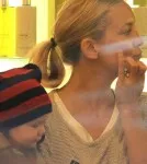 Kate Hudson was spotted shopping with her 8-month-old son Bingham in London on Tuesday. Hudson who wore a sweater with jeans held her adorable tot as she browsed the cosmestic section of the department store. Bingham wore a striped sweater and pants paired with a striped pom-pom hat.