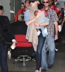 Charlize Theron touched down with baby son, Jackson, in LAX after a whirlwind media tour for her upcoming movie, Snow White and the Huntsman. The Evil Queen herself dazzled on red carpets in Paris, Berlin and London all with little Jackson waiting patiently behind the wings. The duo kept up the fashion show and dressed to impress as they exited the airport. Charlize looked catwalk ready in a denim shirt with skinny jeans, fedora, heels and an over-sized scarf and Jackson looked comfortable in blue and white striped overalls. He’s racked up quite the frequent flyer miles so far hasn’t he? I’m a little jealous!