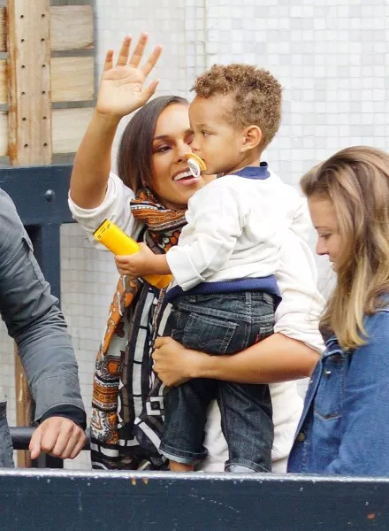 Alicia Keys and her two-year-old son Egypt were spotted leaving the ITV studios in London, England on Wednesday. Little Egypt wore jeans and a white sweater while sucking on AVENT pacifier as he and Keys made their way to a chauffeured car. The happy mom wore a white top, red pants, and black heeled boots as put Egypt in the car and then spent some time waving to fans.