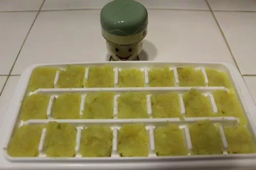 After they were done steaming, I put them in a food processor. I guess the sweet potatoes were too startchy and there wasn’t enough liquid because the food processor wasn’t able to mix and puree them very well. I was getting a little frustrated at the process so I took it out on the sweet potatoes and started mashing them with the potato masher. It wasn’t as smooth as I wanted it but after I mixed it with a little breastmilk it thinned out. The extra sweet potatoes went into ice cube trays to be frozen for later. I am loving the Container Store’s ice cube trays with lids. Great for freezing and storing plus they are very reasonably priced!