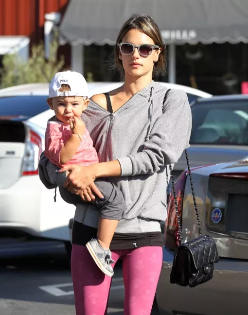 The Victoria’s Secret Angel was dressed in a grey sweater over a blank yoga tank top and bright pink leggings. She carried the 1-year-old baby who was playing with a straw.