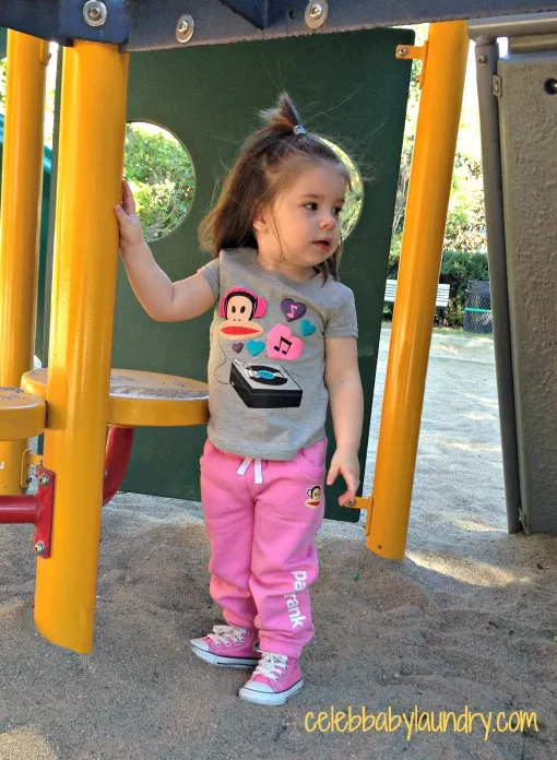 Here is Ava wearing the same Paul Frank Baby-Girls Infant Turntable Tee as Anja. It is available online for $14 at Amazon. She is also wearing pink Paul Frank sweat pants.