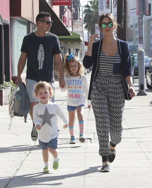 The Sin City: A Dame to Kill For’ actress was dressed casually in a stripped tank, a blue zip up sweater and patterned pants with navy sneakers. Honor held her dad’s hand while Haven happily ran ahead.