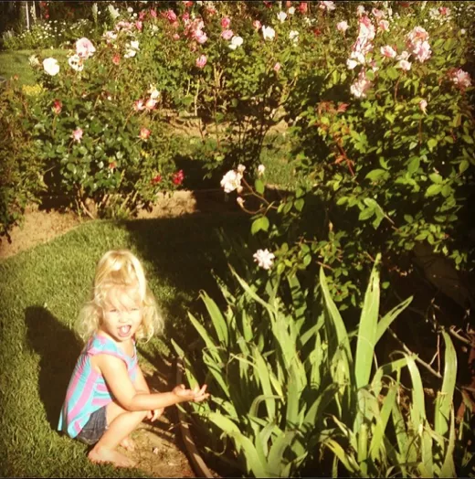 “Stop and smell the roses Maxi… Don’t eat them!!!#rosepetaltongue,” the mom of two captioned the shot of the 23-month-old picking roses in there garden.