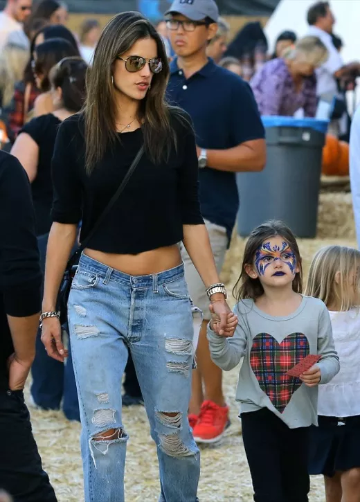 Visiting the pumpkin patch for a second time this season, the Victoria’s Secret model was dressed in a black crop top and ripped jeans. Both of the youngsters got their faces painted before picking out a pumpkin to take home.