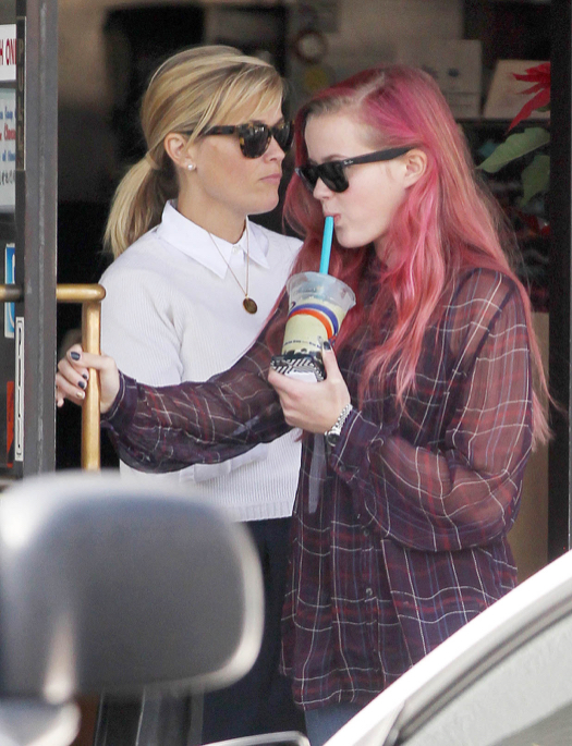 Reese Witherspoon Stops For Drinks With Her Pink-Haired Daughter