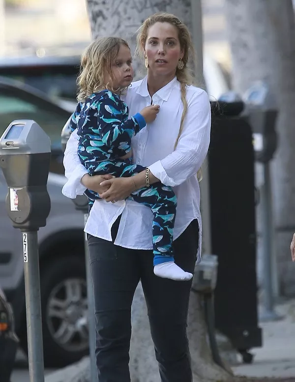 Actress Elizabeth Berkley was spotted out and about with her handsome boy Sky Lauren in Los Angeles on Saturday June 25. Elizabeth was dressed pretty casually in a white shirt and jeans, but not as casually as Sky! The sleepy faced toddler appeared to be wearing pajamas, and his mom toted him down the street because he wasn’t wearing any shoes.