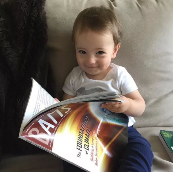 Ginger Zee posted an adorable photo of Adrian posing on the couch reading one of her meteorology books, Zee does the weather for ABC News and Good Morning America. Her happy baby boy was all smiles as he read about “The Foundation of Climate.” Ginger jokingly captioned the photo, “Got home and look what this guy was reading…my BAMS (Bulletin of the American Meteorological Society)#ams #meteorologyjournal #nerdalert.”