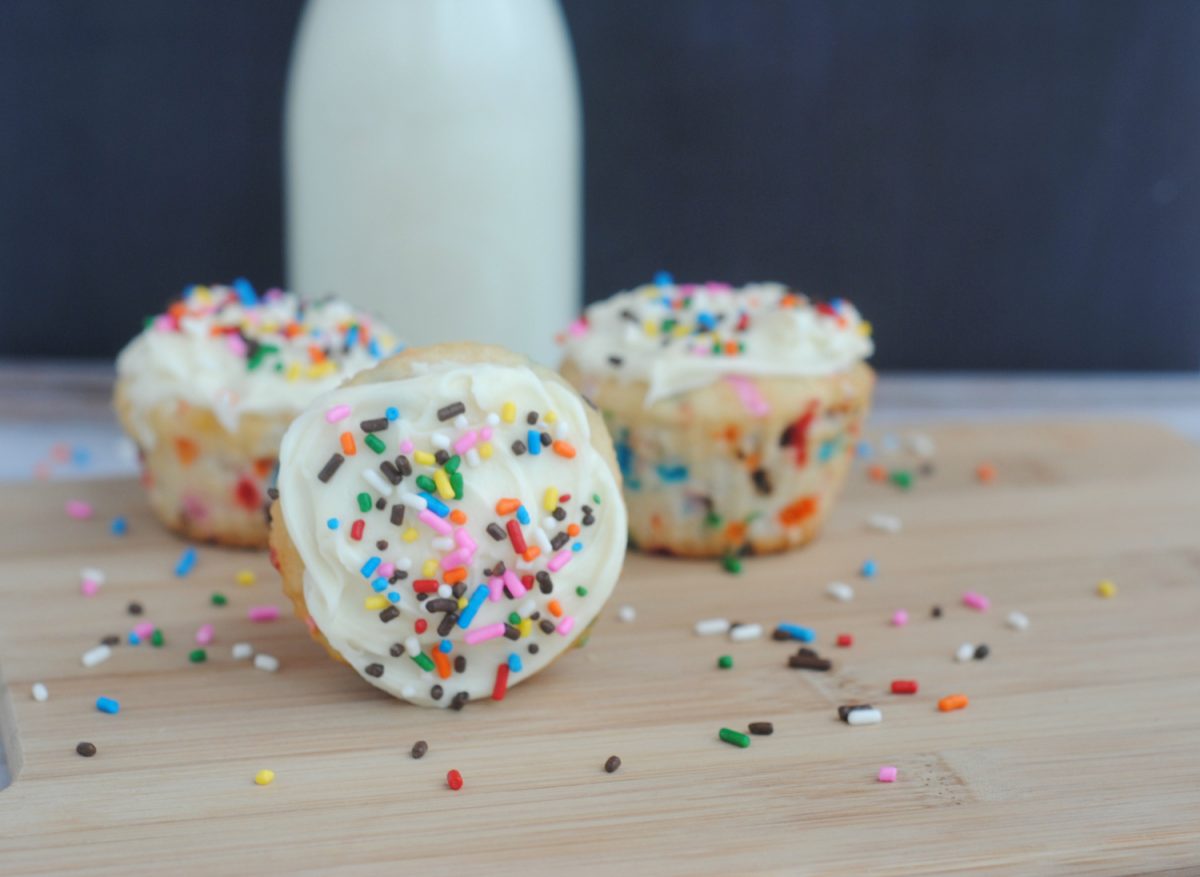 #1. Combine the sugar, butter, vanilla, milk, and eggs and mix well. Stir in flour, baking powder and mix well. Slowly fold in the ½ cup of multicolored sprinkles.