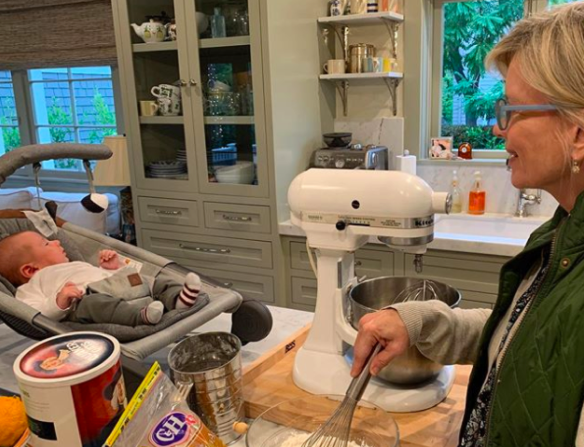 Adorable baby Luca Michael, born to Mary Beth’s daughter Katie and her husband Cory, was born on February 24, 2020 making him not quite two months old. Luca Michael is Katie and Cory’s first child. He is sleeping in a baby carrier on the counter or table where Mary Beth has obviously set everything out for making oatmeal cookies. She commented on the cute photo, “Little helper.”