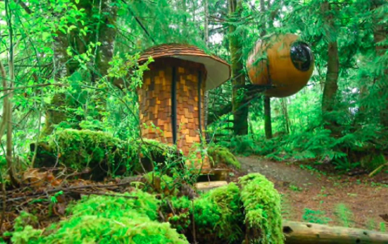 Each Free Spirit Sphere has a spiral staircase and suspension bridge to access them. The exterior resembles giant seeds or nuts and fits in well into the scenery. Staying in one of the orbs gives the chance to view nature from a different perspective.