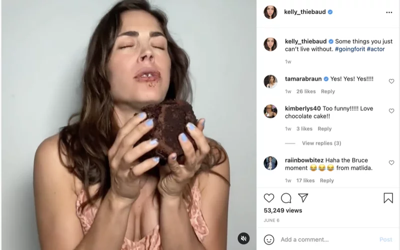 Let’s start with the caption: “Some things you just can’t live without. #goingforit #actor.” Really you have to check out the post to see for yourself what a sensational actress Kelly is, how chocolate cake moves her emote-o-meter from joy to guilt to astonishment.