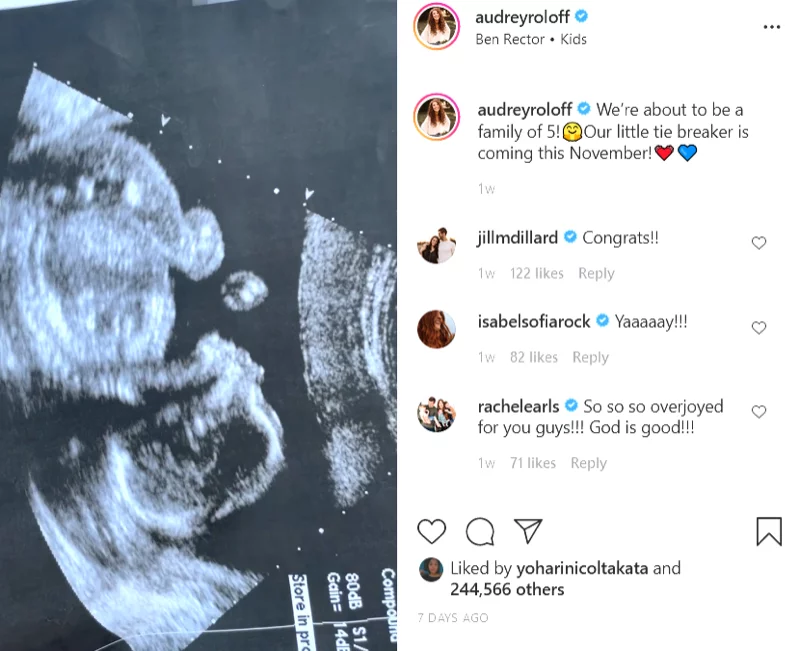 “We’re about to be a family of 5,” Audrey, 29, added in her own Instagram caption of the same clip. “Our little tie breaker is coming this November!”