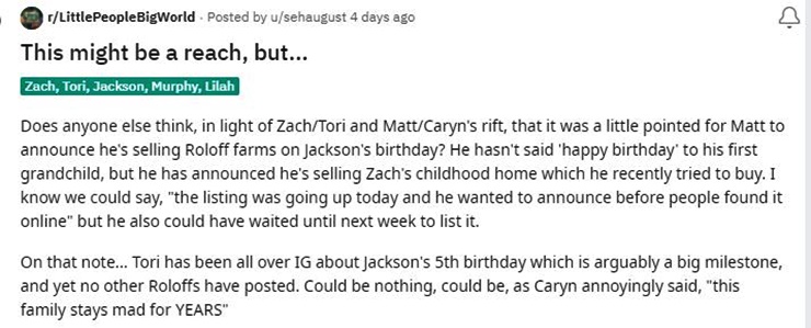 u/sehaugust wrote, “Does anyone else think, in light of Zach/Tori and Matt/Caryn’s rift, that it was a little pointed for Matt to announce he’s selling Roloff farms on Jackson’s birthday? He hasn’t said ‘happy birthday’ to his first grandchild, but he has announced he’s selling Zach’s childhood home which he recently tried to buy.”