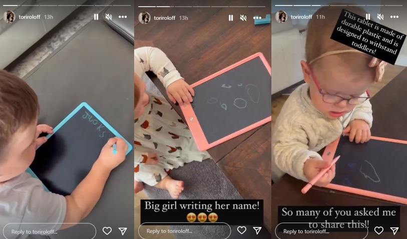 On September 27, Tori took to her Instagram stories and posted up several clips of the kids messing about with a tablet. It’s the kind that little kids can write on. So, Tori said that it’s a useful tool for educating them. Jackson went first, and he wrote his name quite confidently. Next, Lilah had her turn. Did she write her name? Well, not exactly, but she did manage some shapes. Furthermore, she looked terribly studious as she worked.
