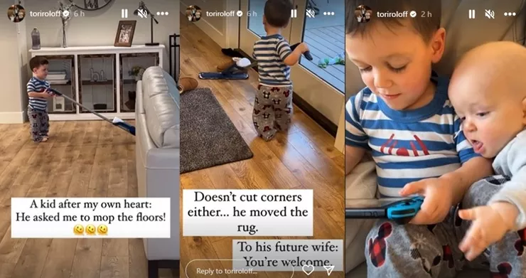 This weekend, Tori took to her Instagram stories and share several photos of her son. In two of them, he revealed his skills in housekeeping. Tori wrote, “A kid after my own heart.” That’s because he asked her if he could “mop the floors.” Tori also noted that he’s a bit of a perfectionist as he even “moved the rug” to make sure he did a top job. So, his mom added, “to his future wife, you’re welcome.”