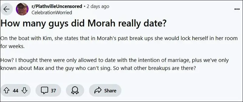 How many guys did Morah really date? On the boat with Kim, she states that in [her] past break ups she would lock herself in her room for weeks. How? I thought there were only allowed to date with the intention of marriage, plus we’ve only known about Max and the guy who can’t sing. So what other breakups are there?