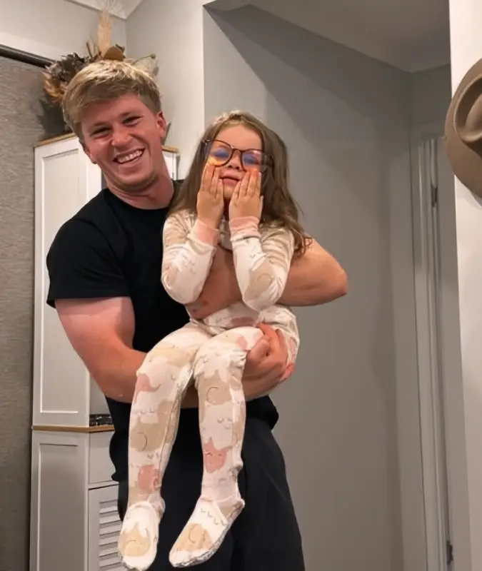 On Instagram, ahead of the weekend, the Crikey! It’s The Irwins’ star posted up a photo of himself easily holding the three-year-old in his arms. She looked cute in her jammies while she wore a pair of eyeglasses.