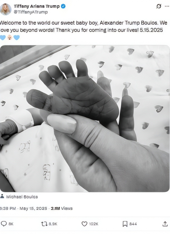 The photo that Tiffany Trump shared on X showed the tiny feet of her newborn son, who arrived on May 15, 2025. Notably, her son is the first grandchild of Marla. In her caption, she wrote, “Welcome to the world our sweet baby boy, Alexander Trump Boulos. We love you beyond words! Thank you for coming into our lives! 5.15.2025